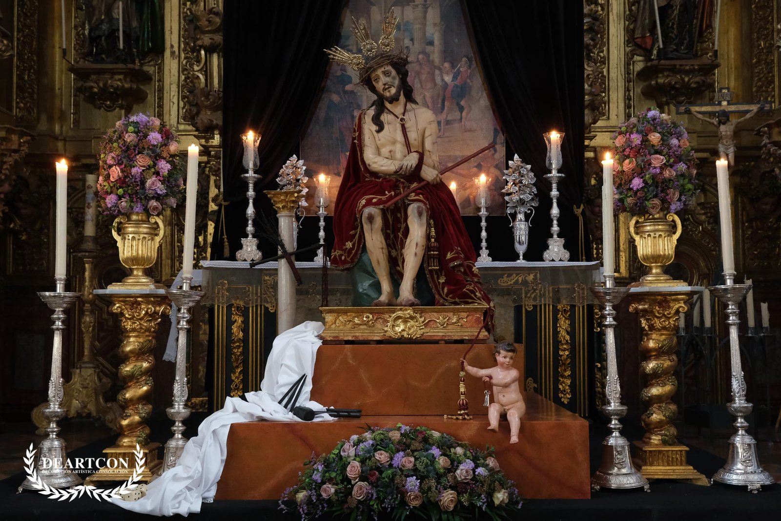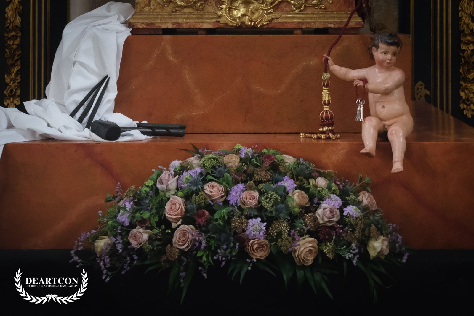 Un montaje elegante y lleno de simbología como esta hermandad acostumbra situado en el altar mayor donde se han seleccionado una gran variedad de flores en tonalidades malva y cardenal. Como podeis observar en la imágenes destacan gran variedad de flores de pequeño tamaño entre la majestuosidad de la rosa ecuatoriana en color lavanda y camel.