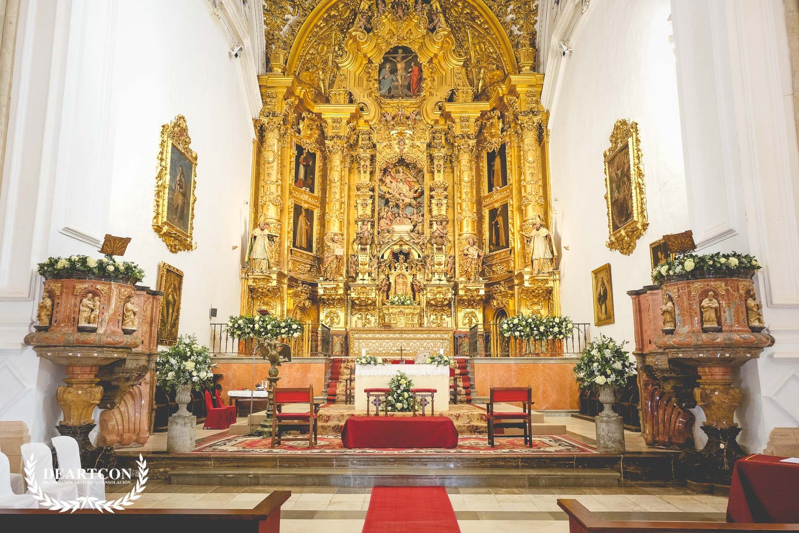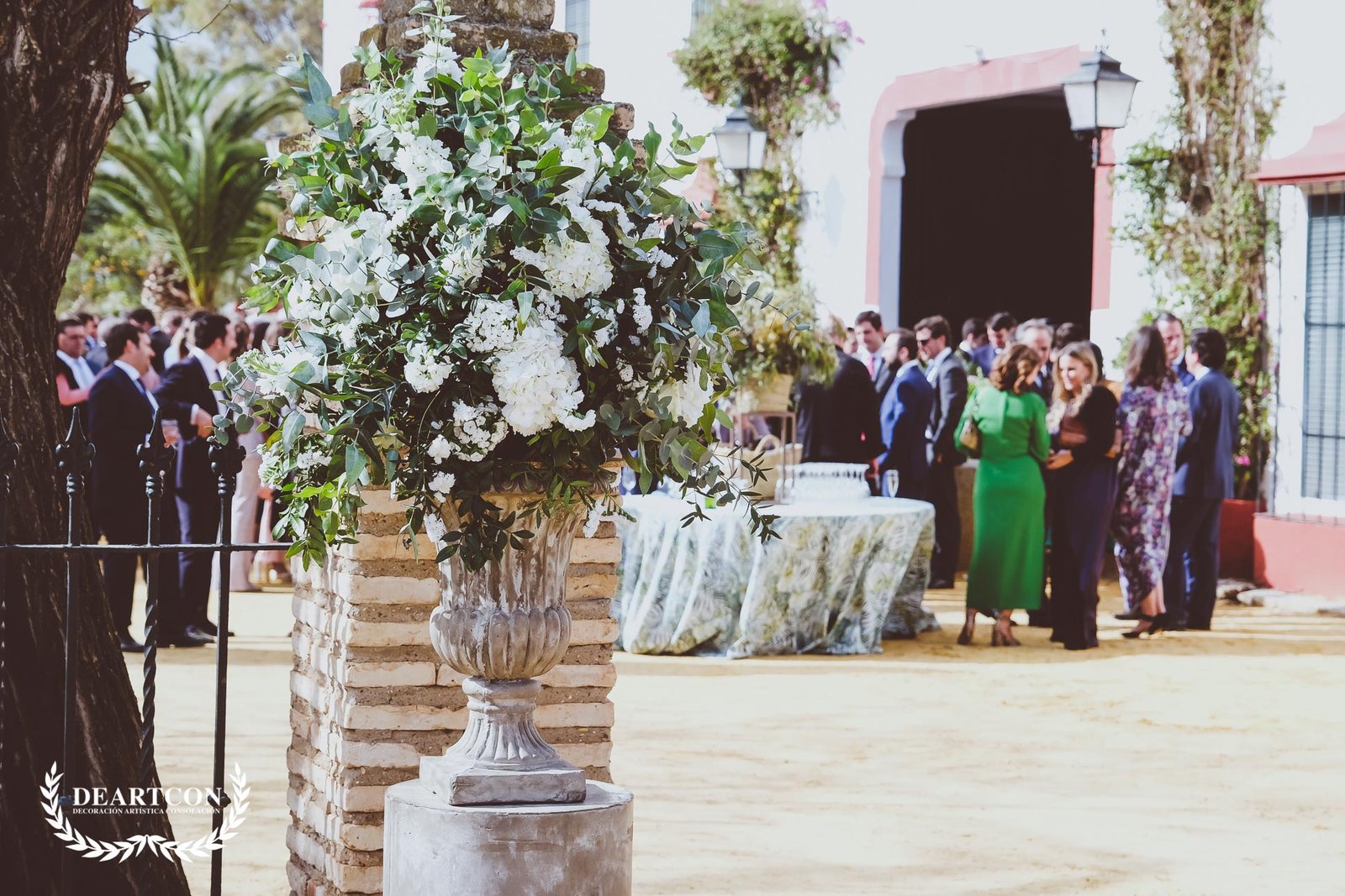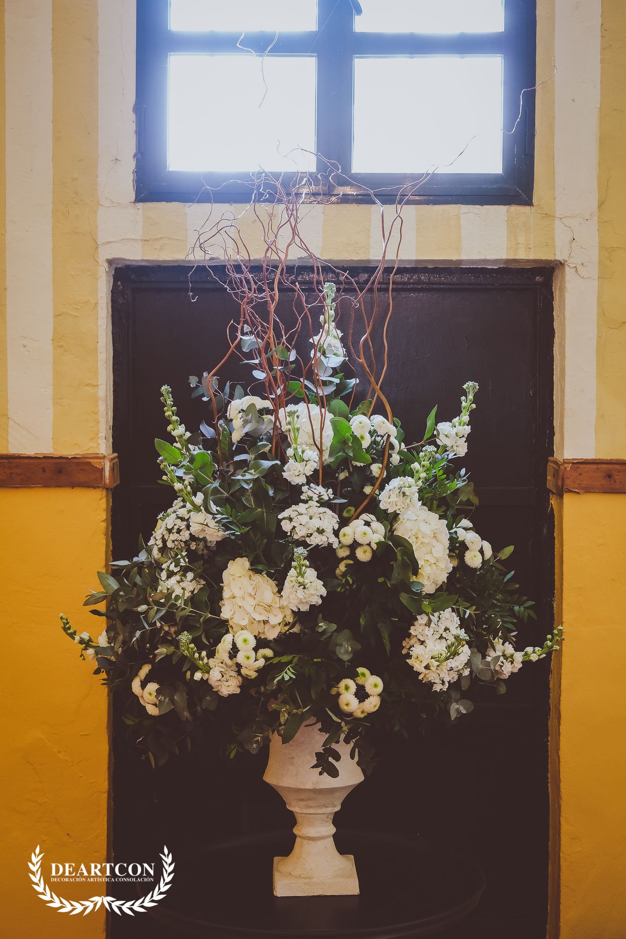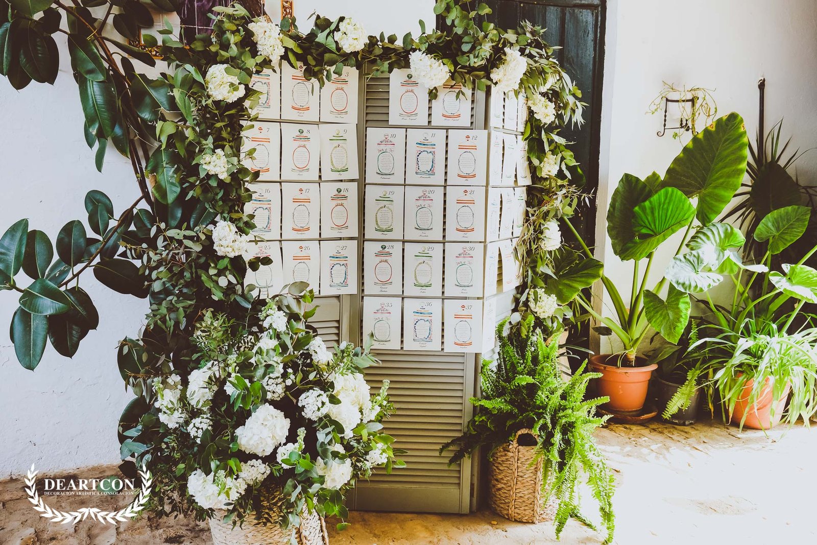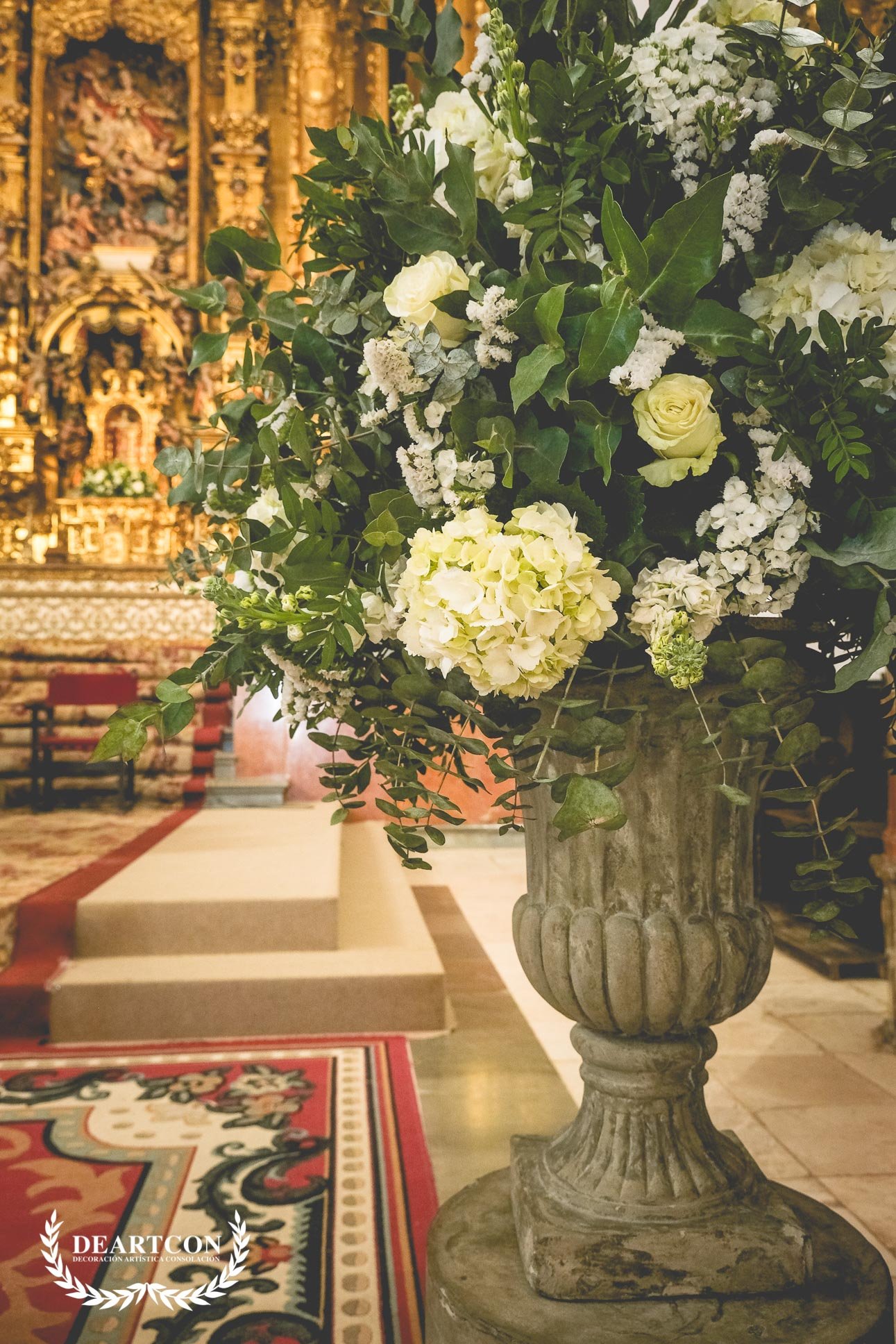 La decoración consistiría en una gran cantidad de centros de flores compuestos por una gran variedad de verdes y como flor principal la Hortensia en color blanco.