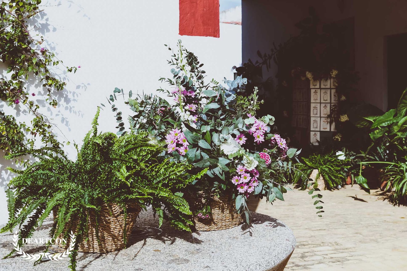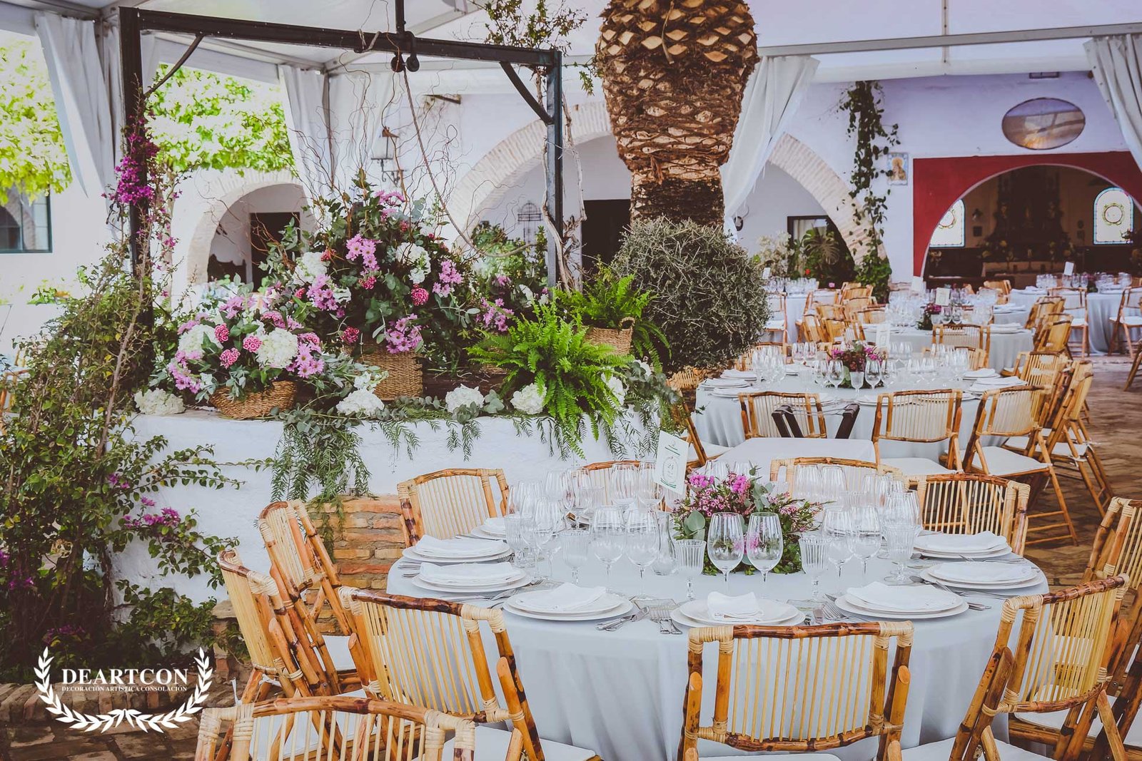 Pilar, la novia, tras varias reuniones en la hacienda le preocupa la decoración Del Pozo central donde se iba a celebrar el banquete por ello nos dijo que se imaginaba una decoración con mezcla de colores alegres pero con armonía entre sí. Por eso utilizamos tonos rosas, bouganvillas, beige y el verde del eucalipto.