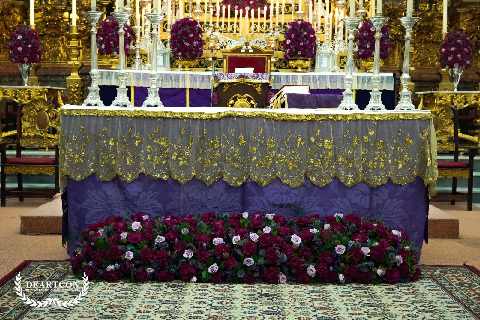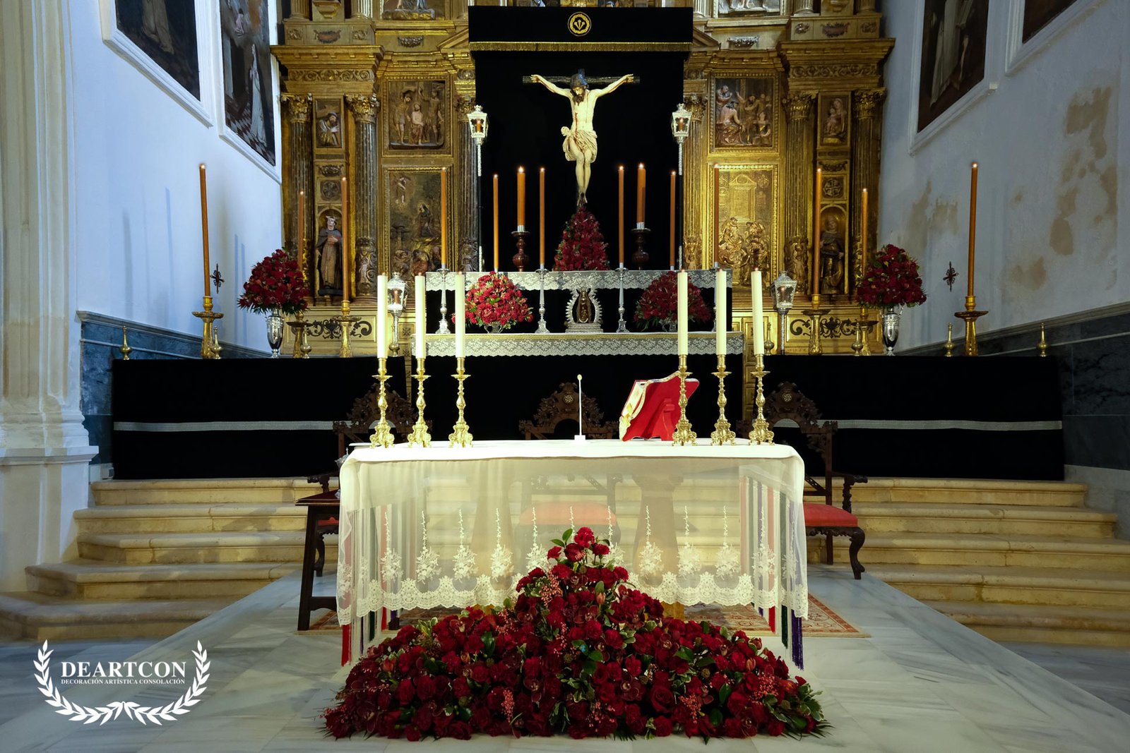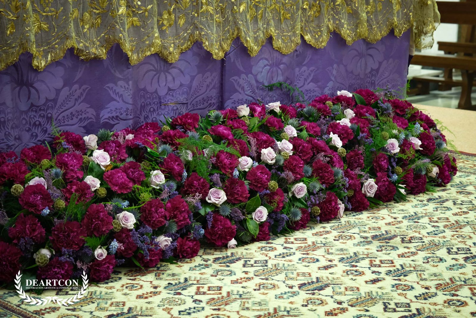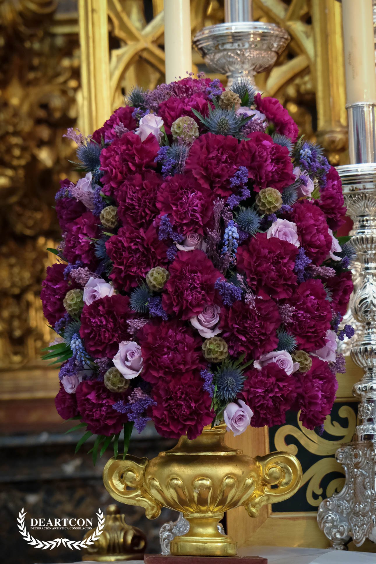 La cuarta semana de cuaresma es para los cultos del Stmo. Cristo de la Misericordia para quien diseñamos un conjunto de flores en color granate. Un altar efímero con la elegancia de centros ingrávidos que daban el sentido fúnebre con la que esta cofradía se caracteriza.