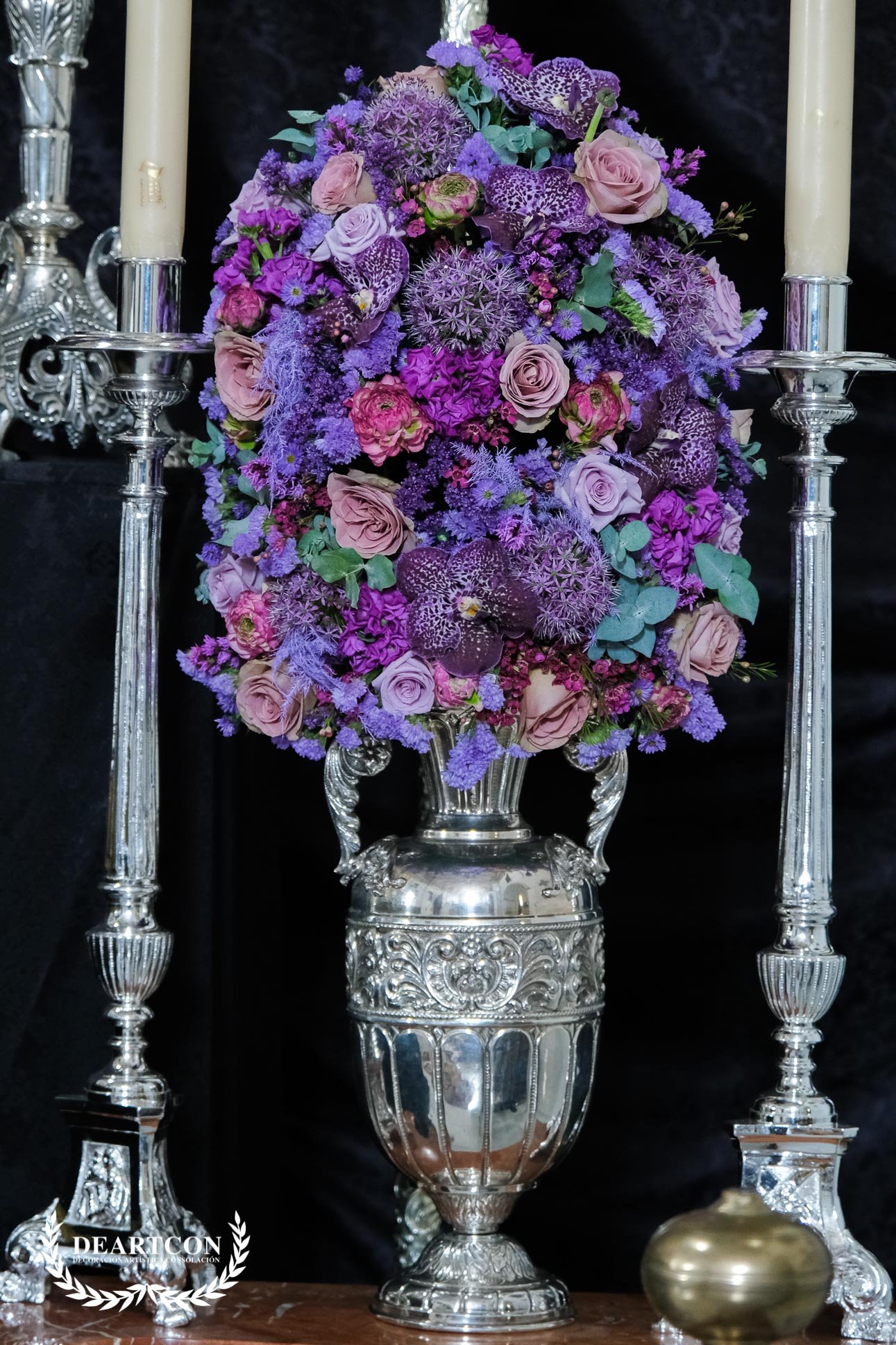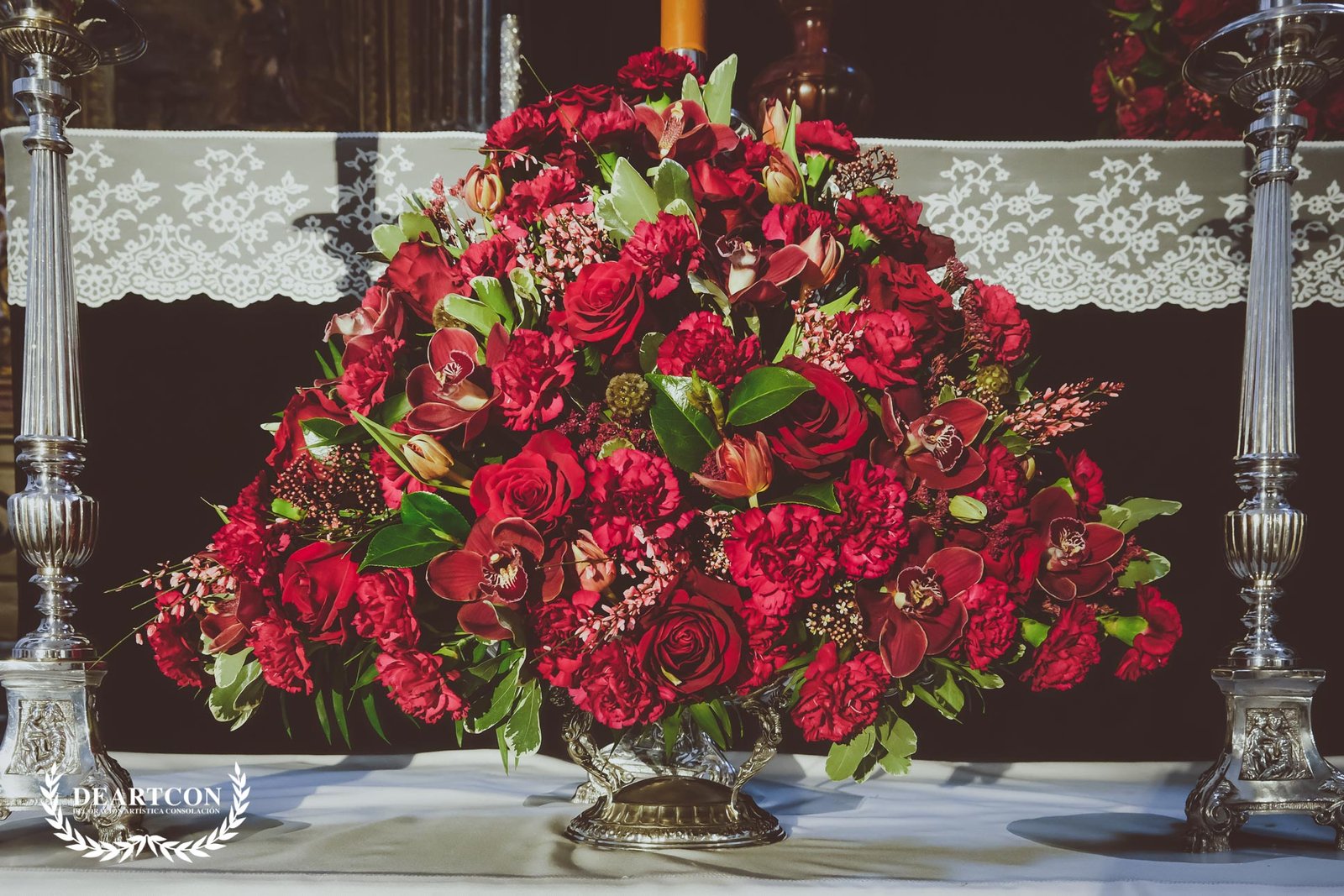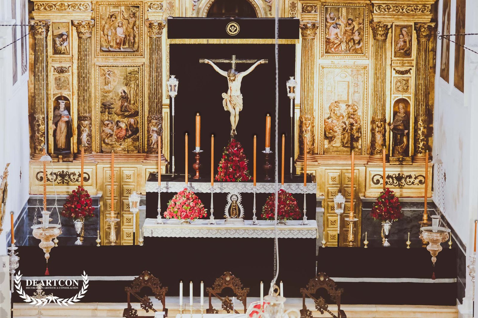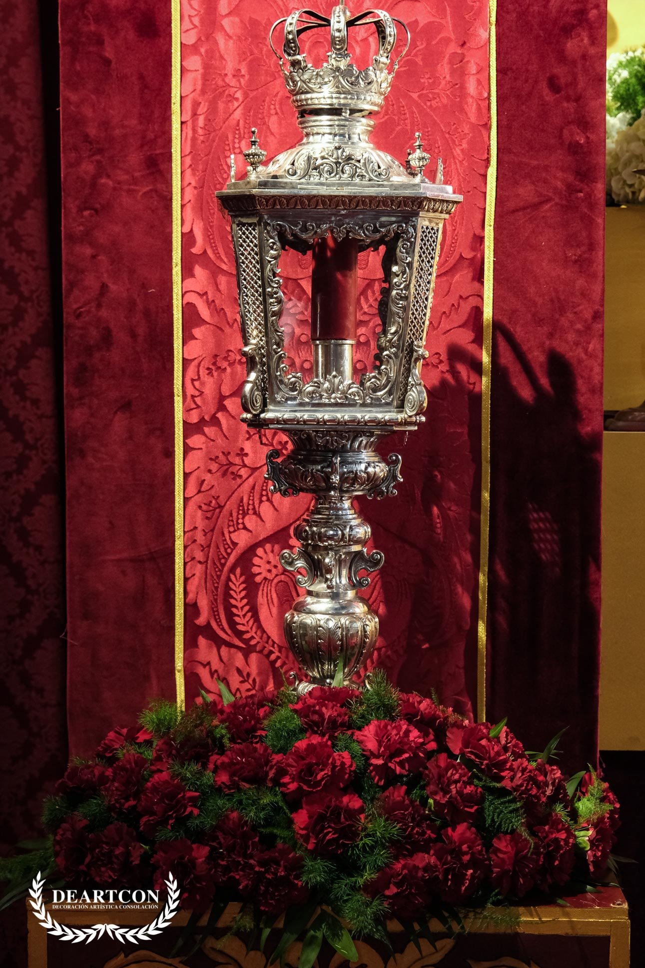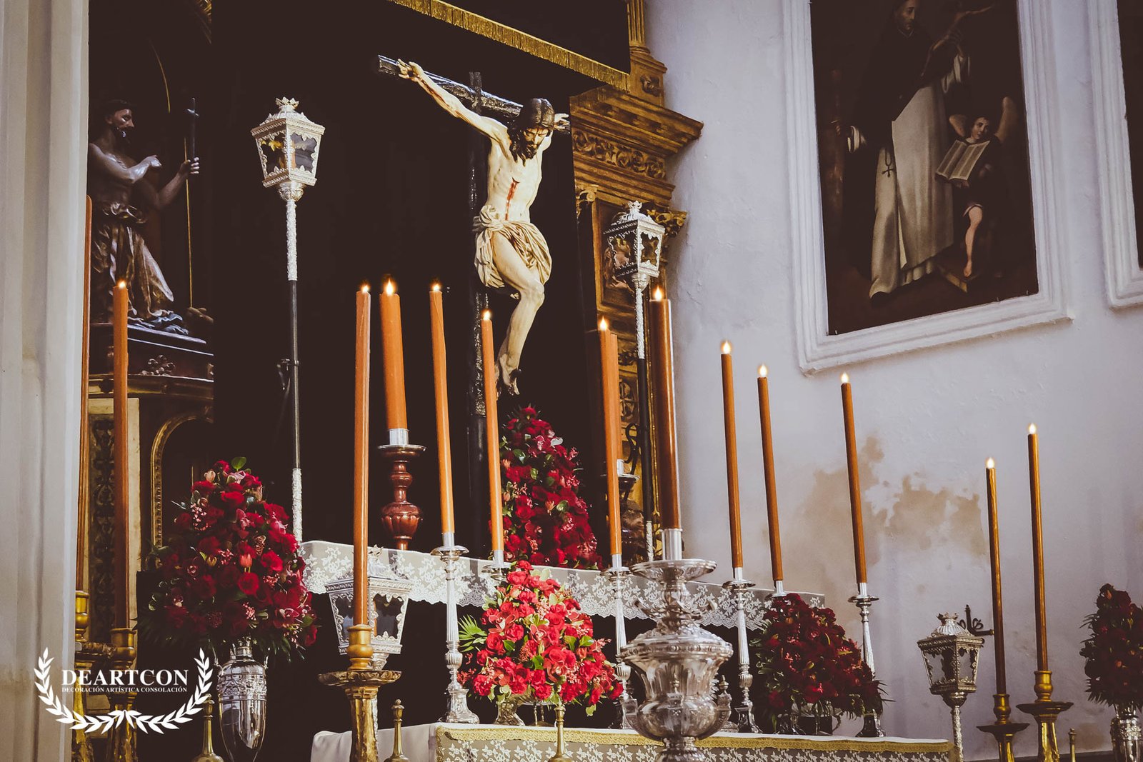 La cuarta semana de cuaresma es para los cultos del Stmo. Cristo de la Misericordia para quien diseñamos un conjunto de flores en color granate. Un altar efímero con la elegancia de centros ingrávidos que daban el sentido fúnebre con la que esta cofradía se caracteriza.