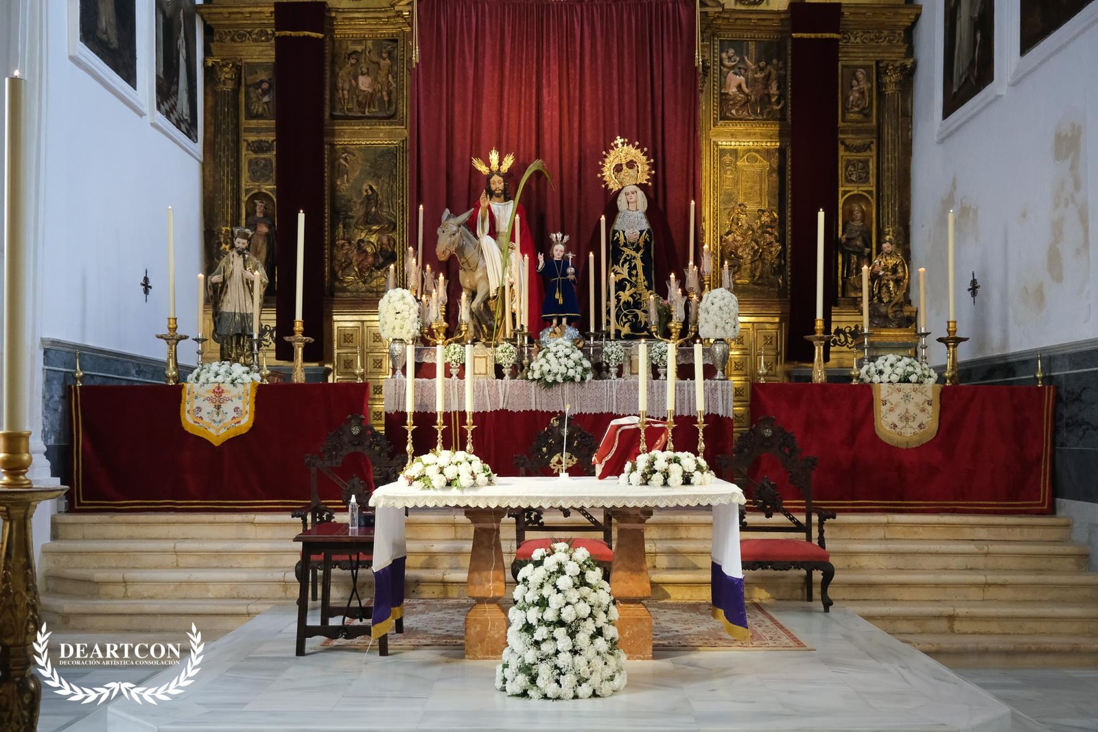La segunda, nuestra querida Hdad. del Dulce Nombre, los exornos más alegres y voluminosos se centran en tres imágenes que nos llenan de esa niñez que un día pudimos disfrutar entre palmas y olivos.